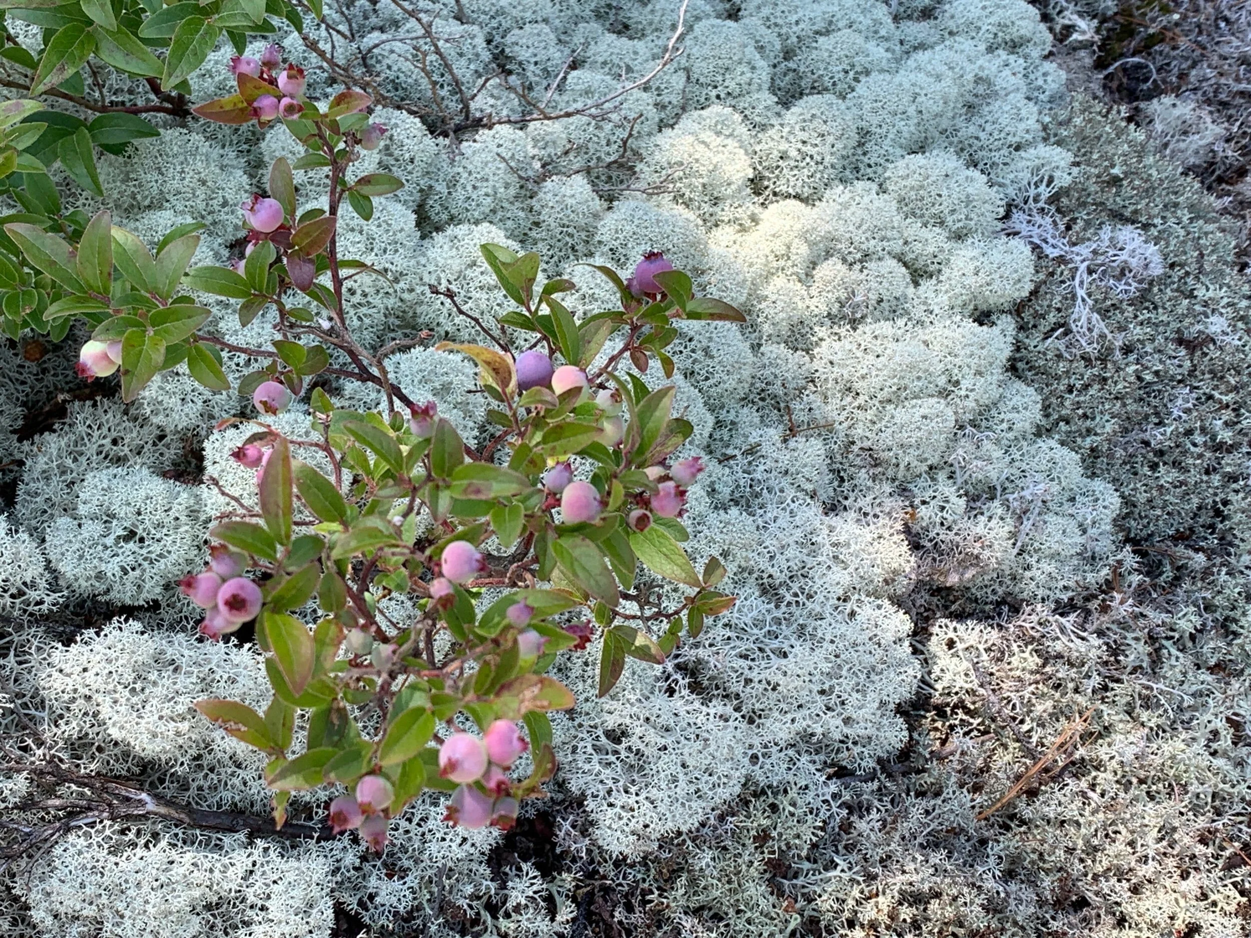 In August, the wild blueberry bushes on Scoville Point are in season, ripened to a deep cobalt blue. Hidden in plain sight, the teensy berries fill the bushes ankle-deep, nestled between juniper and reindeer lichen. In the heat of summer, wild wolves enjoy the sweet morsels and even provision their pups with berries.
