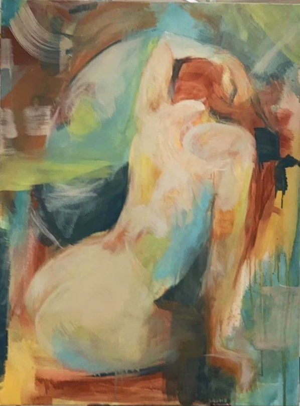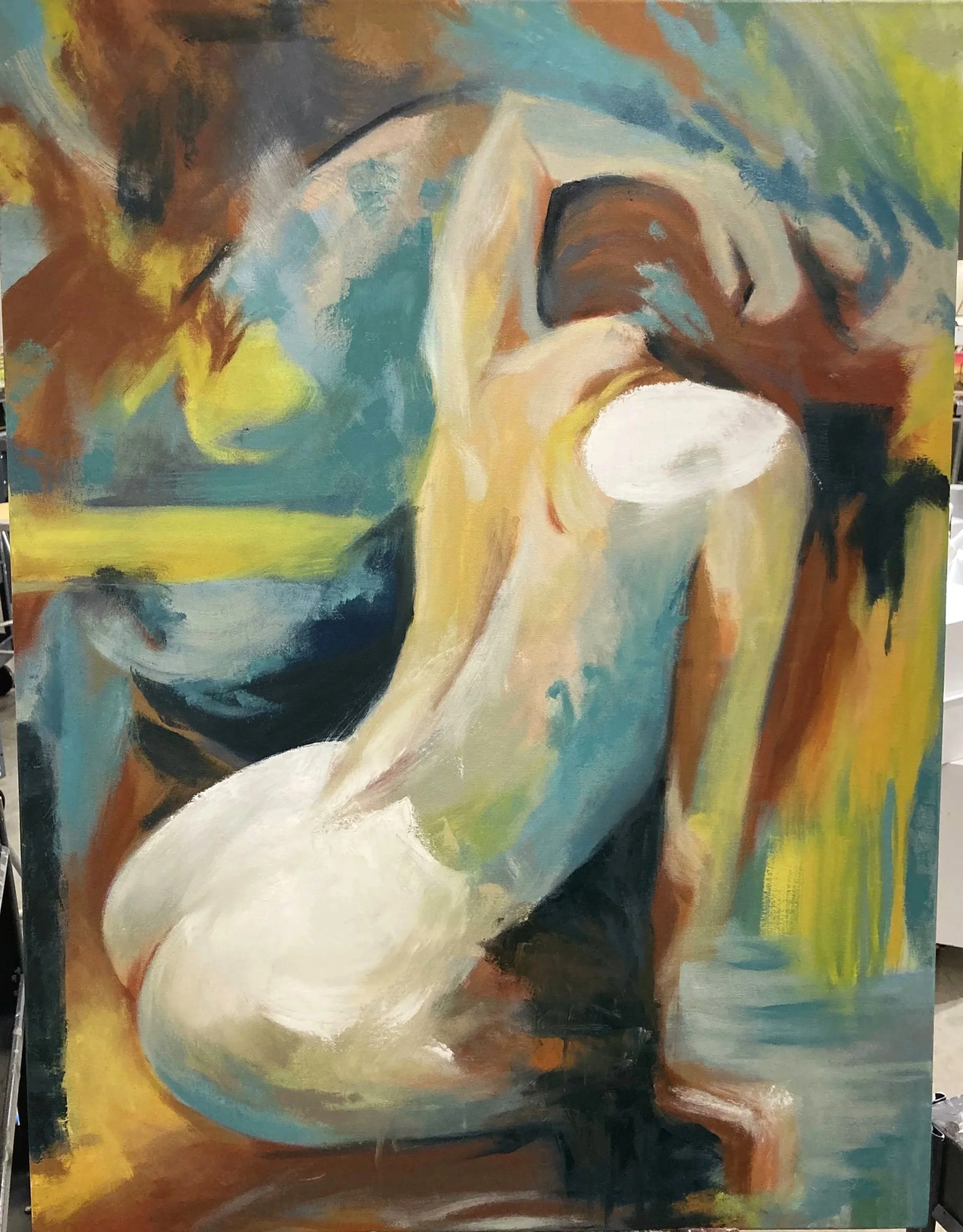 While studying Art Therapy at Edgewood College, Allison made a conscious effort to step away from hyper-realism and loosen up her artwork style. Allison started with a figurative pose and planned a subtle composition based upon the Golden Ratio- swirling motion that leads the eye to the exact squares on her shoulder. The first layer was finished in one session, creating a foundation to build stronger colors, purposeful swipes of the brush, and scrapes of the palette knife.